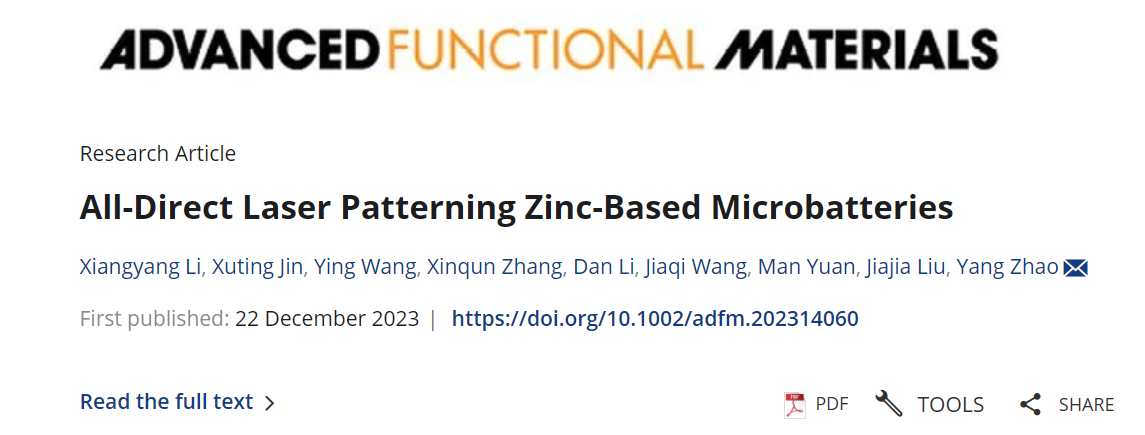 編輯:田柳 審核:王振華 閱讀次數:近日,北京理工大學化學與化工學院博士生李向陽第一作者身份在國際頂級期刊《Advanced Functional Materials》發表題目為“All-Direct Laser Patterning Zinc-Based Microbatteries”的研究論文(DOI:10.1002/adfm.202314060)。北京理工大學為論文第一通訊單位,北京理工大學化學與化工學院趙揚特別研究員為通訊作者。