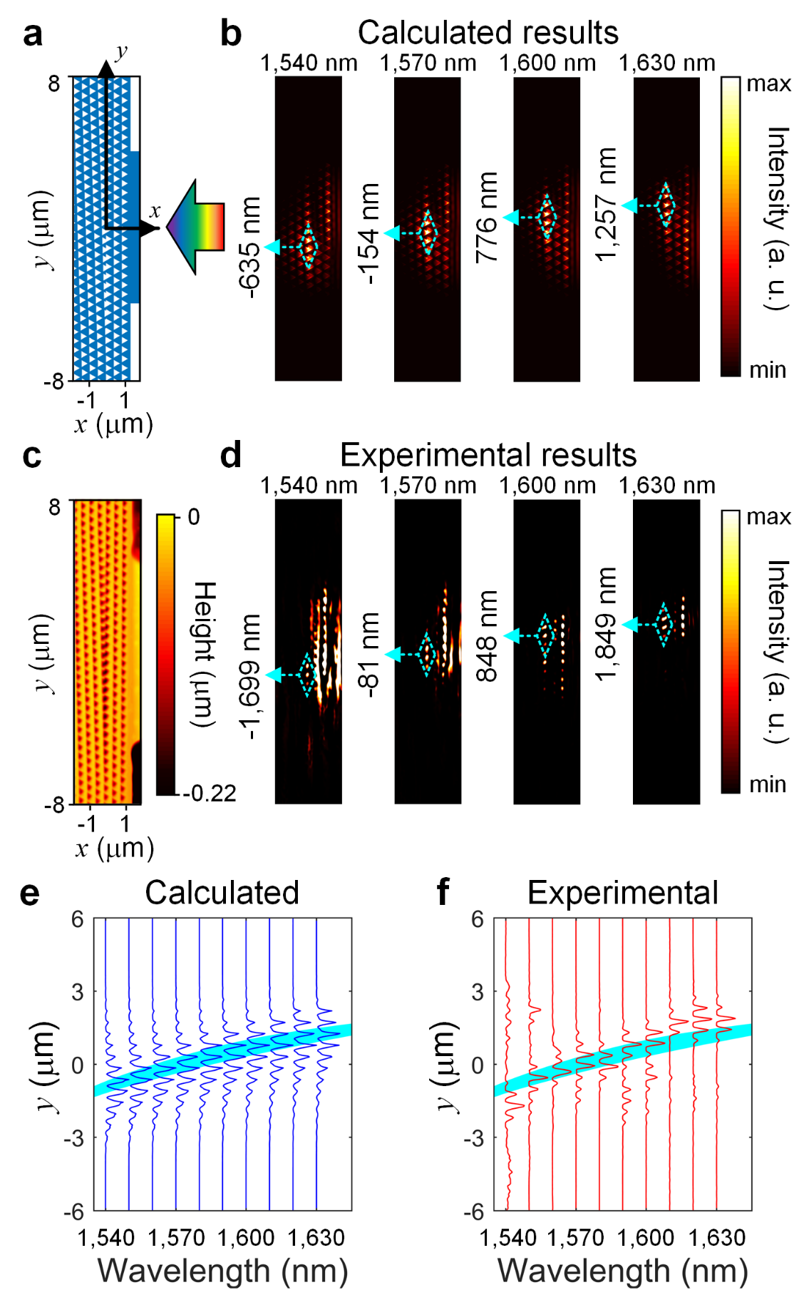 圖2 (a)樣品設(shè)計(jì)圖示例;(b)計(jì)算的不同波長在合成維度光子晶體表面的光強(qiáng)分布;(c)樣品原子力顯微鏡形貌圖;(d)實(shí)驗(yàn)測得的不同波長在合成維度光子晶體表面的表面光強(qiáng)分布,不同波長被囚禁在界面不同晶格位置。