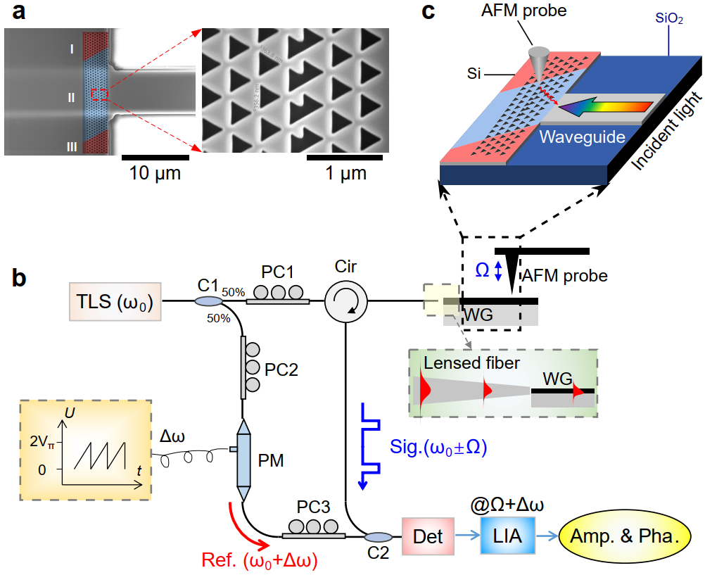 圖1 (a)樣品電鏡圖;(b)樣品測試示意圖;(c)散射式近場光學(xué)顯微鏡實(shí)驗(yàn)裝置圖。
