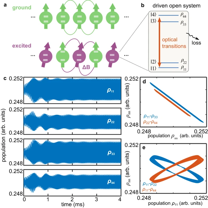 圖1(a)所示為我們研究的多體系統示意圖。原子在激光驅動下會發生躍遷,而躍遷到激發態的原子會通過磁偶極相互作用改變相鄰原子所處的磁場環境,從而引起相鄰原子頻率的改變。圖1(b)所示為原子的能級結構圖,其中光學基態和激發態都分別有兩個自旋能級,從而構成了一個四能級系統。圖1(c)的數值計算結果表明,即使在連續光的作用下,系統的布局數分布是隨著時間不停振蕩的,永遠都不會達到一個穩定的狀態。圖1(d)和(e)進一步展現了時間平移對稱性破缺系統中的極限環動力學過程。這種時間平移對稱性破缺是一種特殊的物質狀態,是在沒有周期性力或腔體的情況下自發形成的。