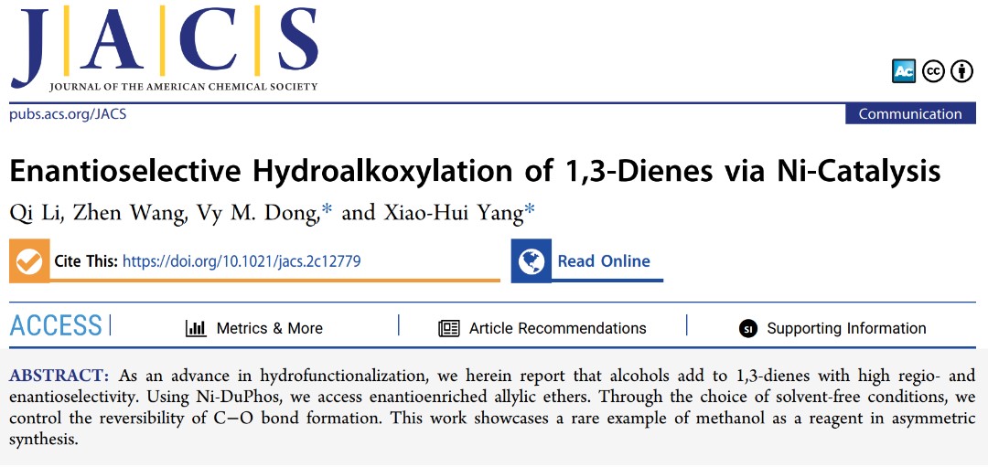 編輯:楊婧 審核:唐水源 閱讀次數:近日,北京理工大學前沿交叉科學研究院&化學與化工學院楊小會教授課題組在Ni催化1,3-二烯不對稱氫烷氧化反應方面取得重要進展,相關結果以“Enantioselective Hydroalkoxylation of 1,3-Dienes via Ni-Catalysis”為題,在國際頂級化學期刊《Journal of the American Chemical Society》上在線發表(DOI: 10.1021/jacs.2c12779)。北京理工大學2021級博士生李琪和王振分別為該論文的第一作者和第二作者。