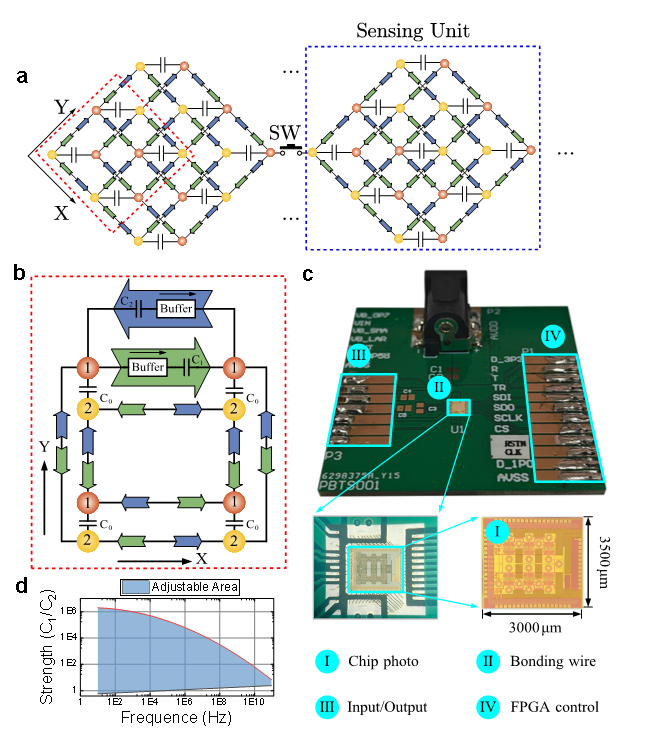 根據(jù)上述理論模型,同時為了靈活地改變系統(tǒng)尺寸,研究人員使用模塊化設(shè)計制備了一個傳感器電路。該傳感電路基于了65nm CMOS工藝。圖2a顯示了兩個模塊單元的示意圖,每個模塊單元對應(yīng)于圖1a所示的3×3的理論模型。模塊中的黃色和橙色球體代表電路網(wǎng)絡(luò)的節(jié)點,對應(yīng)于理論模型的網(wǎng)格。電路節(jié)點之間通過電容器和緩沖器(藍色和綠色箭頭)連接。這里,兩個傳感單元由多個同步開關(guān)(SW)連接和控制。在這種情況下,尺寸為25×25的理論模型需要12個傳感單元串聯(lián)連接。在圖2b中,我們顯示了所設(shè)計電路系統(tǒng)中節(jié)點之間的非互易(非厄米)耦合,這與圖1b所示的模型相對應(yīng)。圖2b中的標記1和2也對應(yīng)于圖1b中的格子1和2。通過控制電容器所在的緩沖器來實現(xiàn)非互易耦合(藍色和綠色箭頭)。相關(guān)的傳感電路實物圖與耦合器件性能參數(shù)展示在圖2c-2d中。