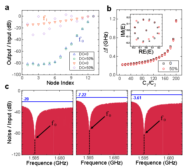 研究人員制備的芯片不僅具有很高的靈敏度,而且有強的魯棒性。為了驗證電路系統(tǒng)的魯棒性,研究人員引入了無序串擾(DC),它是正常情況下實際噪聲強度的1000多倍。在實驗中,在信號輸入節(jié)點額外輸入直流電,并將直流電與主信號的百分比定義為直流電的強度,如10%、25%和50%。圖4a顯示了具有50%無序串擾的電壓趨膚效應(yīng)實驗結(jié)果,這里的參數(shù)與圖3b中的參數(shù)相同。當信號頻率處于本征頻率時,非互易系統(tǒng)中的趨膚效應(yīng)具有極高的魯棒性。即使由50%直流的信號驅(qū)動,系統(tǒng)的集膚效應(yīng)電壓也基本保持不變,如圖4a中的藍色(0直流)和綠色(50%直流)所示。與本征頻率的情況相比,在隨機頻率(紫色和橙色)下,工作信號已經(jīng)完全失真,趨膚效應(yīng)不再存在。相應(yīng)的傳感實驗結(jié)果如圖4b所示。可以看出,在直流電的影響下,系統(tǒng)的傳感性能沒有受到太大影響,仍然保持指數(shù)靈敏度的特性。圖4b的插圖顯示了相應(yīng)的導(dǎo)納譜,表明系統(tǒng)的趨附模式不受直流電的影響。該芯片之所以具有如此良好的魯棒性,不僅是因為高階拓撲特性,還因為電路設(shè)計中,該LC電路本身具有極強的帶阻效應(yīng)。在圖4c中,我們提供了帶阻效應(yīng)的實驗測量結(jié)果,其中的三個面板顯示了DC=-20dB、-7.22dB和-7.23dB的實驗測量結(jié)果。在所有情況下,本征頻率附近都出現(xiàn)了強烈的帶阻效應(yīng)。這種效應(yīng)有助于測量本征頻率時降低噪聲,提高系統(tǒng)精度和魯棒性。
