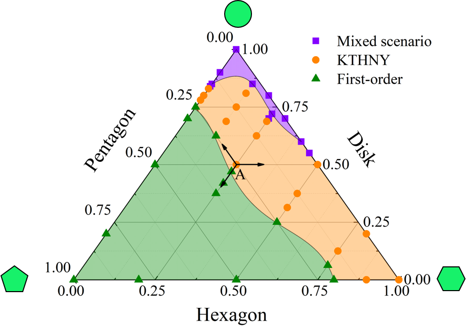 在二組分體系中(圖2上欄 ),混合圓形及正六邊形粒子及混合正五邊形和正六邊形粒子,體系的熔化機理均從一個單組分遵循的機理過渡到另一個單組分遵循的機理;而混合正五邊形及圓形粒子,我們發現混合體系可遵循不同于兩個單組分機理的KTHNY連續相變機理,且此混合體系為低共熔混合物體系。我們進一步研究了體系拓撲缺陷(粒子的近鄰數非6個)的演化,發現在當缺陷濃度大于0.046及大于0.123時(圖2下欄 ),固相與六角相分別失穩,這提供了通過缺陷濃度判定相態的準則。我們進而建立了三元融化相圖,發現KTHNY相變機理總是介于一級相變機理及混合機理之間。本工作為理解二維熔化機理提供了有益啟示。