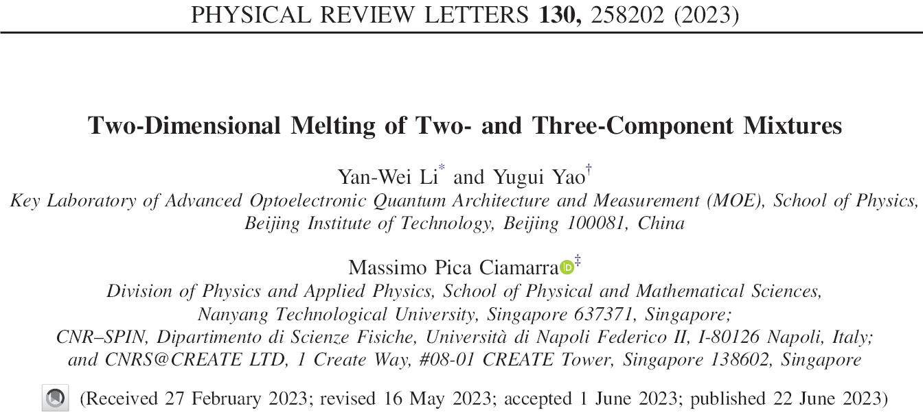 編輯:王莉蓉 審核:陳珂 閱讀次數:近日,北京理工大學物理學院李艷偉研究員、姚裕貴教授同新加坡南洋理工大學數學物理學院Massimo Pica Ciamarra教授合作,在二維熔化研究中取得重要進展,相關結果發表在物理學頂尖期刊Physical Review Letters上。