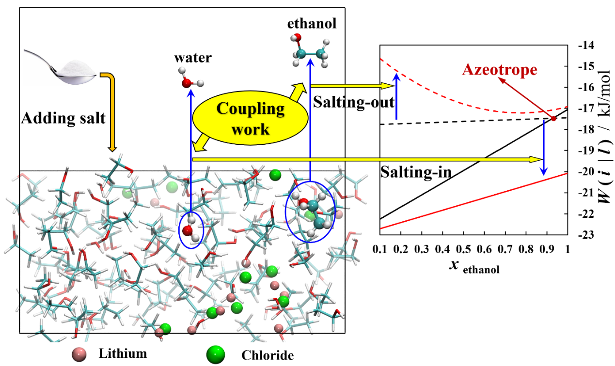 研究團隊將以上的理論研究結(jié)論和計算方法應(yīng)用于化工精餾過程中經(jīng)常遇到的最高共沸物和最低共沸物的體系,同樣獲得了很好的結(jié)果,解釋了共沸現(xiàn)象發(fā)生的過程和機理(圖3)。另外,通過對加鹽精餾過程的模擬,也解釋了加入物質(zhì)分離劑后的鹽析和鹽溶效應(yīng)。這部分的工作發(fā)表在《Chemical Engineering Science》(https://doi.org/10.1016/j.ces.2023.118751,影響因子:4.7,2區(qū)Top),李彌異為第一作者和通訊作者,劉賀磊教授同為通訊作者。
