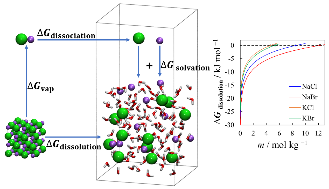 固體鹽在溶劑中的溶解過程可等價的用蒸發(fā),氣相解離和溶劑化過程來描述(圖1)。每一個獨立步驟可由各物質(zhì)的基礎(chǔ)物理化學(xué)性質(zhì)所計算,這使得模擬溶解過程以獲得溶質(zhì)溶解度的方法可通過滿足熱力學(xué)的自洽性來獲得。基于此,高效和準確的分子動力學(xué)模擬流程在論文中被提出,新的和可靠的分子力場參數(shù)被關(guān)聯(lián)出來。通過與實驗數(shù)據(jù)對比發(fā)現(xiàn),論文所提出的理論方法和計算公式能很好的描述鹽的溶解度、活度系數(shù)、密度等性質(zhì),并且能精確的描繪出電解質(zhì)溶液的微觀結(jié)構(gòu)與性質(zhì)。通過研究也發(fā)現(xiàn),現(xiàn)有的非極化力場對于極濃的體系(LiCl-水,20 mol/kg)不能很好的描述固液平衡行為,相關(guān)的工作將在后續(xù)完成。