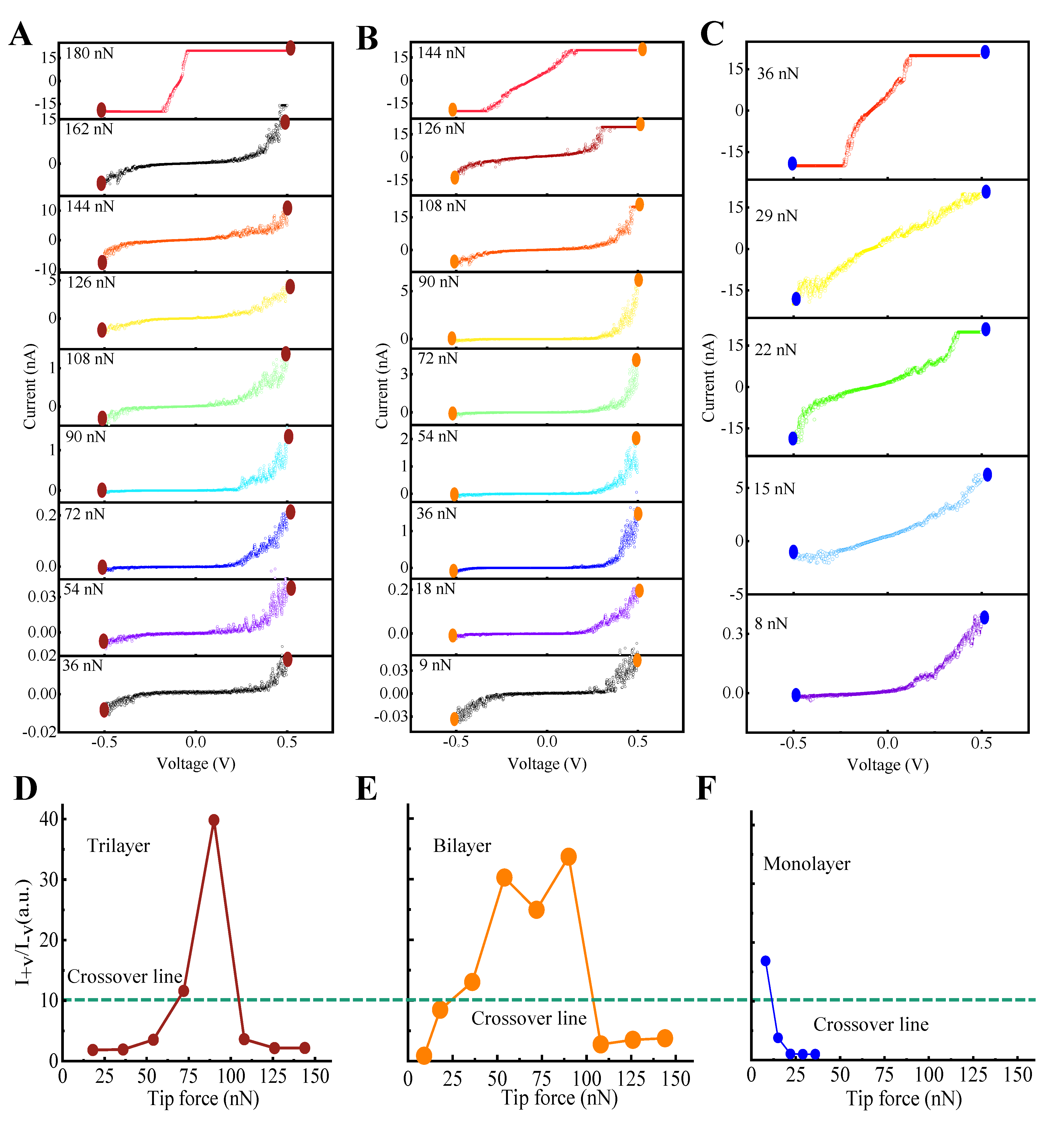 圖2. 針尖力調制三層、雙層和單層CIPS垂直結的電流整流效應。(A至C) 分別為三層、雙層和單層CIPS在逐漸增大的針尖力下的電流-電壓(I-V)曲線。正負電壓端的電流比值用于描述電流整流比。(D至F) 分別為隨著針尖力增加,三層、雙層和單層CIPS的電流整流比結果。