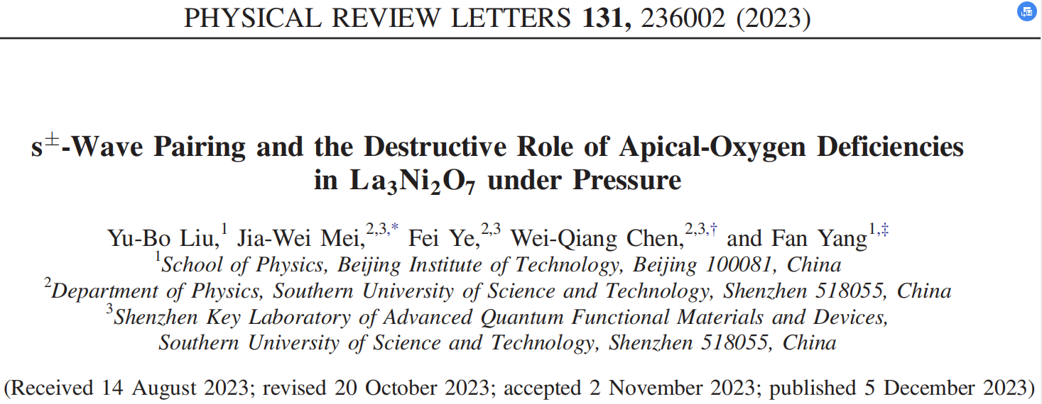 該工作相關(guān)論文”s±-Wave Pairing and the Destructive Role of Apical-Oxygen Deficiencies in La3Ni2O7 under Pressure” 在國(guó)際頂尖刊物《Phys. Rev. Lett》上發(fā)表,獲得國(guó)際學(xué)術(shù)界的廣泛認(rèn)同和跟進(jìn),成為目前該研究領(lǐng)域的重要理論研究之一[arXiv上已被引用30余次]。楊帆教授指導(dǎo)的博士生劉玉波博士為論文的第一作者。楊帆教授與南方科技大學(xué)陳偉強(qiáng)教授、梅佳偉教授為該論文的共同通訊作者;參與論文工作的還有南方科技大學(xué)葉飛教授。工作得到國(guó)家自然科學(xué)基金重點(diǎn)項(xiàng)目、面上項(xiàng)目的支持。