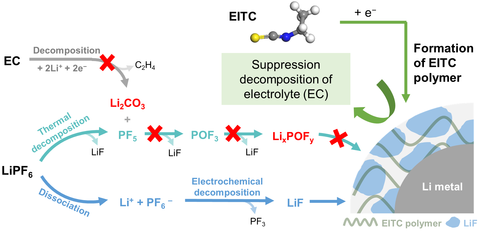 不同鋰沉積量下鋰金屬的表面形貌以及鋰成核沉積行為研究發現,在EITC參與形成的SEI下,鋰更傾向于沿著平行電極的方向生長,形成“島狀”形貌,而非鋰枝晶的“樹枝狀”形貌。進一步的理論計算、原位拉曼測試以及TOF-SIMS表征,證明了EITC在鋰金屬表面自聚成膜后會抑制EC分解,即減少Li2CO3的產生,進而影響LiPF6熱分解路徑的后續反應進程,不再產生LixPOFy;相反的,LiPF6的電化學分解路徑持續進行,使得LiF在SEI中積累,最終在常規1 M鋰鹽濃度的碳酸酯電解液中,形成了富含LiF的SEI。