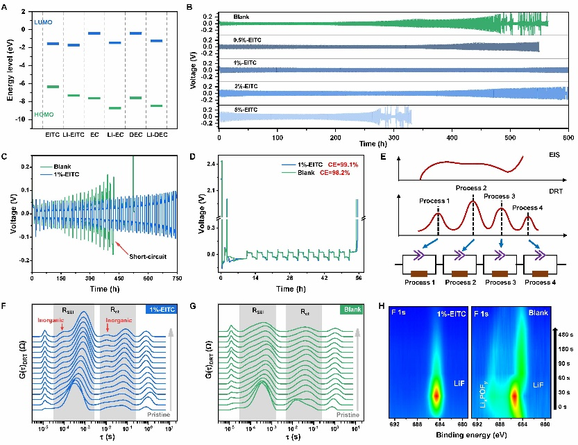 研究通過理論計算和成分分析(XPS)確定了EITC在鋰金屬表面的自聚合行為,并通過Li||Li對稱電池和Li||Cu半電池測試和驗證了EITC對鋰金屬負極電化學性能的改善作用。不同電解液體系中鋰金屬負極的弛豫時間分布(DRT)分析和XPS分析發現,在EITC調控下的鋰金屬表面形成了富含LiF的SEI,而無添加劑組的SEI中存在大量LixPOFy中間產物。