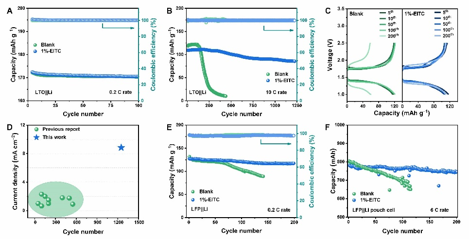 含有1%-EITC的LTO|Li電池在10 C下循環1000次后,仍能保持81.4%的容量。此外,1 Ah LFP|Li軟包電池,在6 C下同樣具有穩定的循環性能,在200次的循環中實現了95%的容量保持率。該研究通過電解液添加劑的方式調控界面化學,在“非高濃“條件下成功得到富含LiF的SEI,為電解液調控金屬鋰界面化學的設計提供了一些新思路。