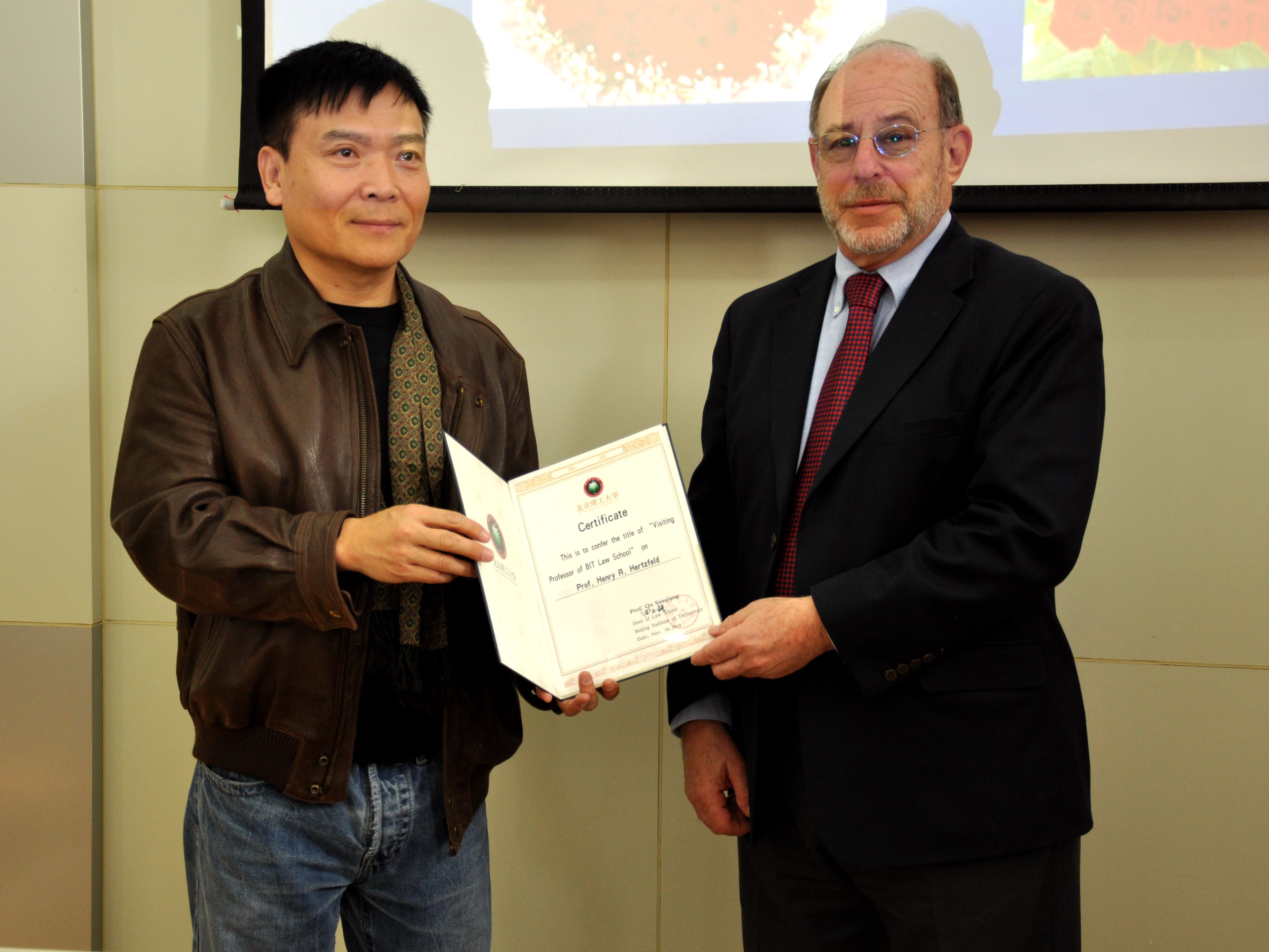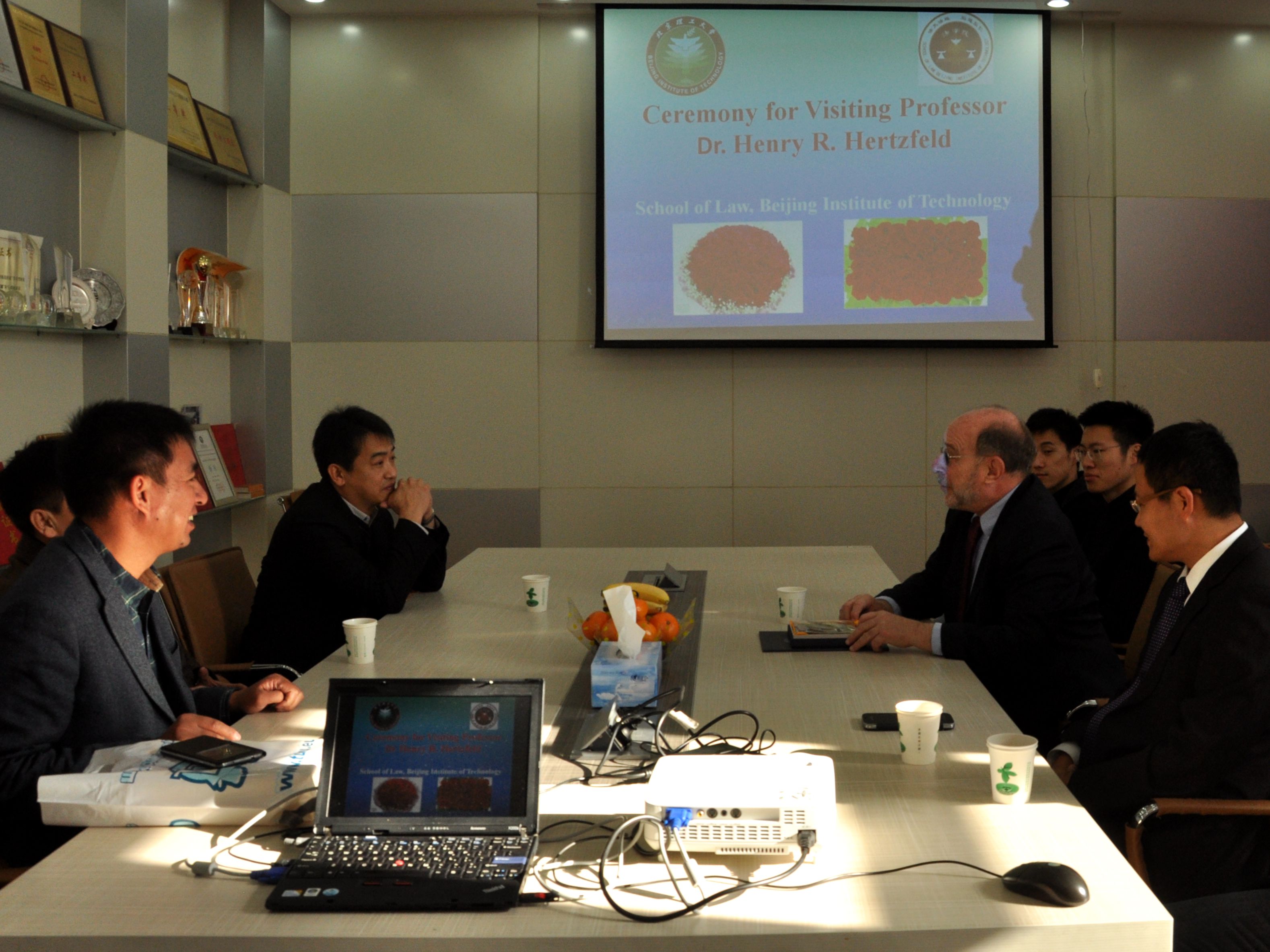 2014年11月24日上午,北京理工大學法學院兼職教授聘任儀式在中心教學樓1313室舉行。法學院聘任Dr. Henry R. Hertzfeld教授為法學院兼職教授。出席本次聘任儀式的有:法學院院長曲三強,法學院黨委書記楊海,法學院副院長李壽平,法學院辦公室主任王福亮。會議由副院長李壽平主持。