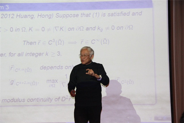洪家興院士報告的題目是“regularity of solutions to degenerate elliptic Monge-Ampere equations”。橢圓 Monge-Ampere 方程是偏微分方程研究領域的熱點問題之一,許多國內外著名學者,包括丘成桐教授、Pogorelov教授、Spruck教授等都針對此類問題進行了大量的研究工作。但關于退化橢圓 Monge-Ampere 方程解的正則性, 這類問題比較困難,一般性結果也相對較少。洪院士首先介紹了部分學者的重要研究成果,然后介紹了近幾年自己及其合作者在這一方向的最新研究進展,之后對部分結果的證明過程及所用的數學工具進行了簡要的說明 。