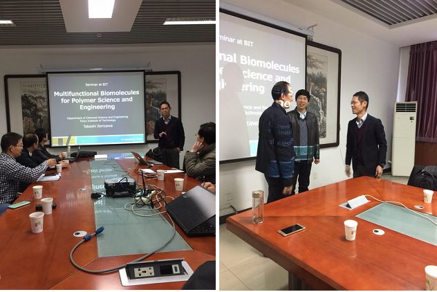 2016年12月14日,應北京理工大學材料學院北京市纖維素及其衍生材料工程技術研究中心邀請,日本東京工業大學(Tokyo Institute of Technology)物質理工學院應用化學系Takeshi Serizawa教授訪問材料學院,并做了題目為“Multifunctional Biomolecules for Polymer Science and Engineering”的學術報告。北京理工大學材料學院黨委書記張青山教授,院長助理張加濤教授,工程中心負責人邵自強教授,以及學院和工程中心其他老師和研究生們參加了此次報告會。