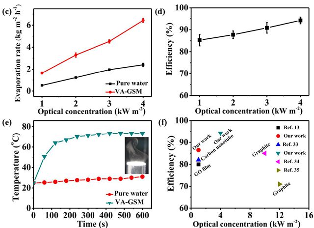 經過測試,該膜分別在一個光源和四個光源的情況下,水的蒸發率能達到1.62 kg· m-2·h-1和6.25 kg·m-2·h-1,其太陽能轉換率分別可達到86.5%和94.2%,這比以往報道過的大多數碳材料的太陽能轉化率都要高。而這種用途對于緩解水資源危機起到了很好的作用,它可以將不同來源的水(海水、廢水以及濃酸、濃堿溶液)高效快速地轉化為凈水。在之前相關方面的研究中,采用的材料為3D陽極氧化鋁膜、聚吡咯沉積不銹鋼網、基于金納米顆粒薄膜的無塵紙等,它們不能在有機、強腐蝕性酸和強堿等惡劣環境中使用,因此不能實現產業的規模化。而文中得到的VA-GSM材料具有高孔隙率、高吸光率,而且在惡劣環境中也能夠穩定存在(能承受3000 oC的高溫以及-196 oC的低溫),優勢十分明顯。