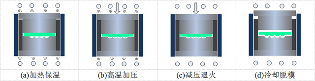 (a)加熱保溫 (b)高溫加壓 (c)減壓退火 (d)冷卻脫模