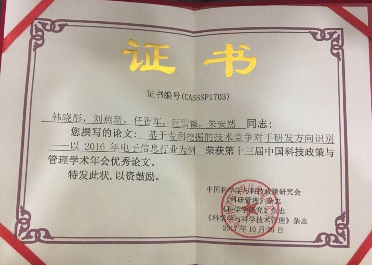 編輯:仇業(yè)涵 審核:顏志軍 閱讀次數(shù):2017年10月28-29日,北京理工大學(xué)知識(shí)管理與數(shù)據(jù)分析實(shí)驗(yàn)室2017級(jí)博士生韓曉彤在第十三屆中國(guó)科技政策與管理學(xué)術(shù)年會(huì)上獲得優(yōu)秀論文獎(jiǎng),受到與會(huì)學(xué)者的廣泛關(guān)注,進(jìn)一步提升了我校在技術(shù)創(chuàng)新管理和科技政策領(lǐng)域的影響力,為我校贏得廣泛贊譽(yù)。據(jù)悉,本次會(huì)議共收到來自國(guó)內(nèi)高校、科研院所及企事業(yè)單位專家學(xué)者的380余篇學(xué)術(shù)論文,經(jīng)專家多輪嚴(yán)格評(píng)審,最終16篇論文獲優(yōu)秀論文獎(jiǎng)。中國(guó)科學(xué)學(xué)與科技政策研究會(huì)理事長(zhǎng)穆榮平研究員為獲獎(jiǎng)作者頒發(fā)優(yōu)秀論文證書。