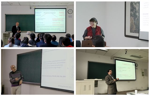 法國里爾大學的Bourbigot教授和Jimenez教授、德國弗勞恩霍夫研究院的D?ring教授、英國博爾頓大學的Kandola教授、印度烏特卡爾大學的Sahoo教授、美國佐治亞大學的Yang教授、瑞士國家實驗室的Gaan教授、西班牙加泰羅尼亞理工大學的Haurie教授、美國紐約州立大學石溪分校的Rafailovich教授、都靈理工大學Giovanni Camino教授和Alberto Frache教授等諸多阻燃領域國際知名教授,舉辦了系列講座二十場,從多個角度對新型阻燃劑設計、膨脹阻燃新概念、納米阻燃新趨勢、聚合物阻燃關鍵技術、阻燃防火評價方法等阻燃領域的重要問題進行了分析探討,和我校師生開展了熱烈深入的討論交流,對我校阻燃領域今后的研究開拓了新的思路、新的方向。