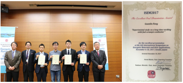 編輯:鐘艷玲 審核:武志文 閱讀次數:日前,第六屆含能材料及其應用國際研討會(The 6th International Symposium on Energetic Materials and their Applications,ISEM 2017)在日本仙臺召開,北京理工大學宇航學院推進課題組王寧飛教授、李世鵬教授、隋欣副教授、方冠林博士、官典博士、李周波博士和周海霞博士等應邀參加了會議。此次會議中,我校宇航學院王寧飛教授特邀作為分會場主席主持會議。2015級博士生方冠林(導師:魏志軍教授、武志文副教授)撰寫的論文 “Experimental study on a long-time working solid-fuel scramjet combustor ”受到評審專家的高度認可,獲得優秀口頭報告獎(The Excellent Oral Presentation Award),該獎只有五名作者獲得。此為我校宇航推進課題組在國際會議上的首次獲獎,進一步提升了我校在航空航天領域的影響力。