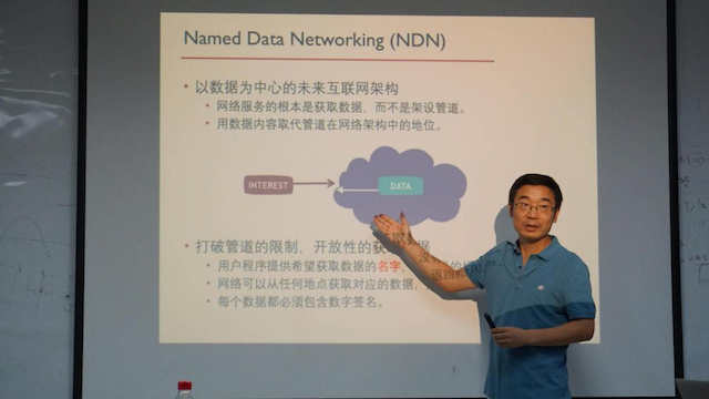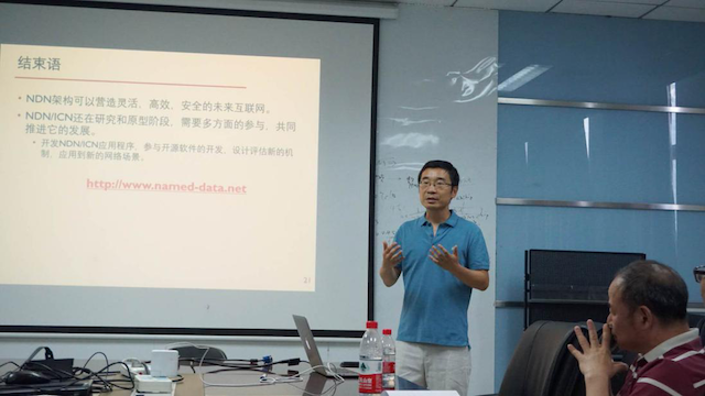 Beichuan Zhang副教授介紹了未來互聯網的信息化發展趨勢,分析了以數據為中心的未來互聯網架構研究的重要意義與應用前景,并具體介紹了NDN研究團隊目前主要研究方向,給出了以數據為中心的組網關鍵問題和解決方法。