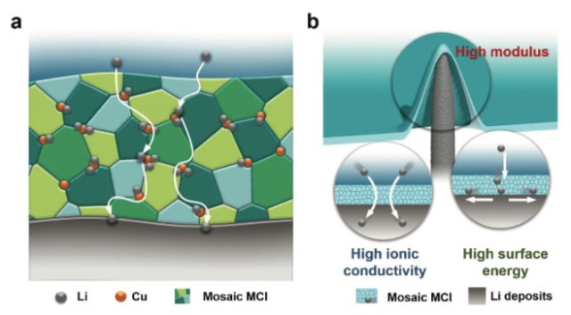 該團隊通過化學液相反應法,在金屬鋰電極表面設計了具有高楊氏模量、快速離子傳輸特性的離子/電子混合導體界面層(Mixed conductor interphase,簡稱MCI)。MCI層作為固液界面層(Solid electrolyte interphase,SEI)和金屬鋰電極之間的過渡層,在具有高離子導率的同時兼顧一定的電子導率。MCI層(圖1)中離散分布的銅原子打破了相對長程有序的晶體結構,形成了更多的晶界和多晶區域缺陷(圖2),保證了鋰離子在界面層中的快速傳導,微弱的電子導率為鋰離子在界面層中的遷移提供了遷移電場作為驅動力,對于定向引導鋰離子輸運具有重要價值。