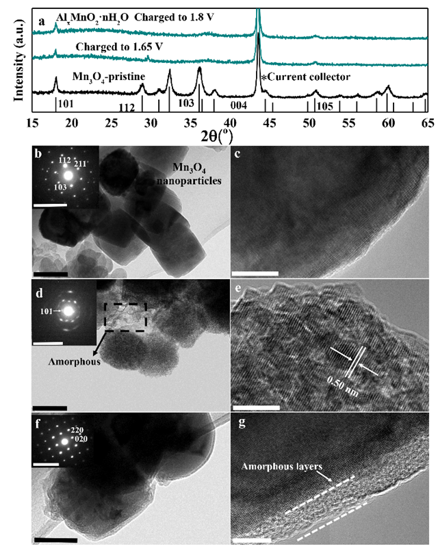 研究者通過X射線衍射和透射電鏡更直觀的觀察了原位轉化反應中材料結構的變化,發現原位轉化反應過程中,尖晶石相的Mn3O4逐漸無定形化,僅保留了少部分的層狀相。在高分辨透射電鏡結果中可以看出,與反應前的尖晶石型Mn3O4相比,反應產物AlxMnO2·nH2O具有一層明顯的無定形層(圖2)。