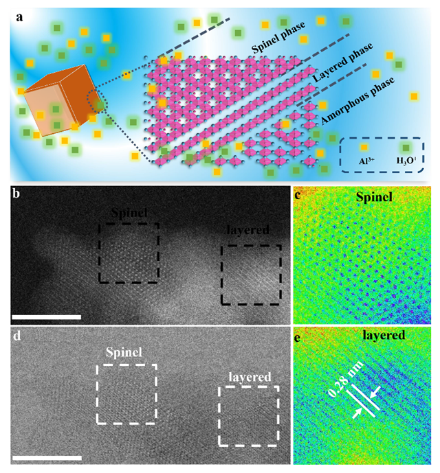 利用球差校正電鏡可以觀察到材料原子級別的排布,在電流和水系電解液的作用下,四面體位的Mn2+和部分八面體位Mn3+從尖晶石結構中溶出,在電流作用下被氧化形成的無定形相重新沉積在原本的納米顆粒表面,所以在球差電鏡中可以清晰地看到尖晶石、層狀和無定形相混合存在的現象。表面的含水無定型層結構有利于鋁離子的嵌入脫出,使得正極材料具有快速脫嵌鋁離子的能力。