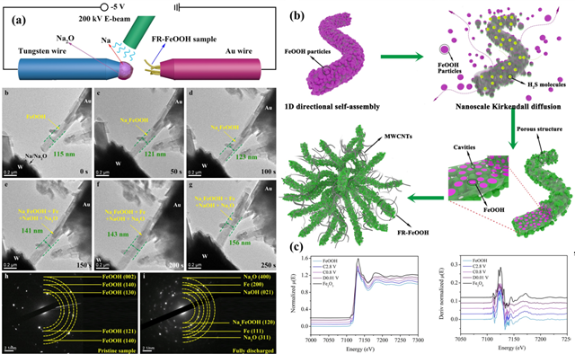 圖1(a)原位TEM分析FeOOH電極的儲鈉過程中體積形變和儲鈉機理(b)多孔FeOOH納米棒團簇的合成過程示意圖(c)近邊結(jié)構(gòu)吸收光譜研究FeOOH的儲鈉機理