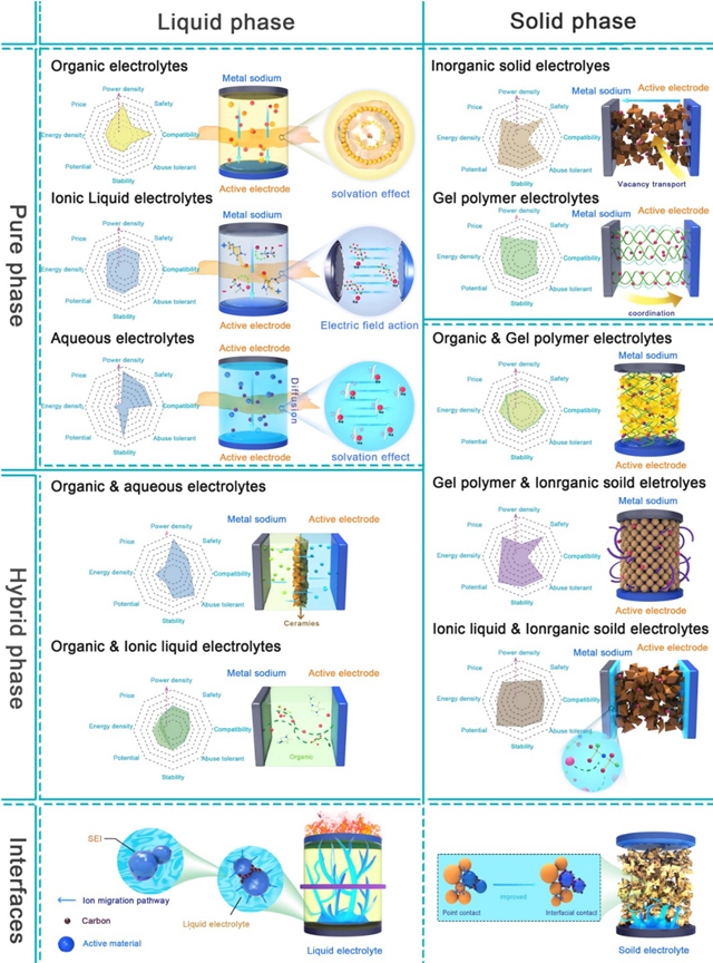 圖2 具有不同狀態(tài)(液體和固體)和組分(純相和混合相)的鈉離子電池電解質(zhì)和界面的模型,以及這些電解質(zhì)和相應(yīng)界面的主要性質(zhì)