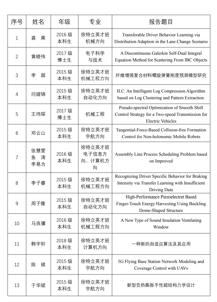 在下午分論壇學術(shù)交流環(huán)節(jié),13名同學分兩組在分會場作報告,17級博士生王瑋琛的電動汽車平滑換擋優(yōu)化研究了電動汽車的平穩(wěn)換擋控制策略,優(yōu)化控制后離合器發(fā)動機換擋挺度可提高約60%,可以較好的跟蹤最優(yōu)解的運動軌跡,具有實時性和有效性;15級本科生李子睿通過遷移學習的手段,實現(xiàn)了通過少量數(shù)據(jù)的輸入完成從成熟的駕駛員模型到新的個性化駕駛員模型的轉(zhuǎn)變,而且通過改進算法,實現(xiàn)了少數(shù)據(jù)量下80%以上的預測準確度,高于其他方法的70%,完成了算法層的突破;18級本科生韓宇軒,對傳統(tǒng)的數(shù)值積分公式做出了自適應(yīng)算法上的改進,展現(xiàn)出非同尋常的科研創(chuàng)新熱情和能力。論文交流后,現(xiàn)場評委老師對大家的報告進行了點評:楊國孝十分認可同學們?nèi)〉玫某晒隙诵焯亓W院學子科研中展現(xiàn)出的學科融合的特點;胡紀濱肯定了大家的學術(shù)精神,并希望大家繼續(xù)保持蓬勃的求知欲,多問幾個為什么,研究課題的目的是什么,用的定理是怎么來的。