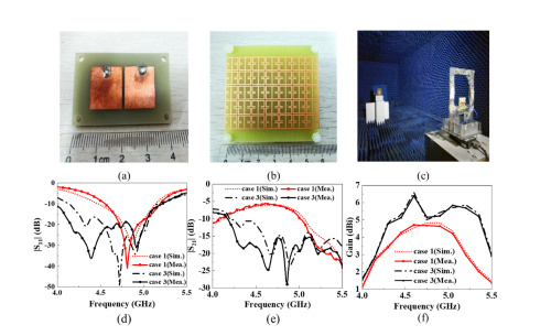 超材料是由人工設(shè)計的復(fù)合材料,具有一些天然材料所不具備的超常物理性質(zhì),該團隊設(shè)計了具有超寬帶超材料提升5G MIMO天線系統(tǒng)性能,通過將超材料結(jié)構(gòu)放置在5G MIMO天線的上方做為覆蓋層,在極近的天線距離(1毫米,即0.017個波長)下實現(xiàn)了良好的耦合抑制效果,同時增加了5G MIMO天線的工作帶寬和輻射增益,并制造實物實驗驗證了理論分析的正確性。該項工作為實現(xiàn)寬帶近距離的5G MIMO天線小型化系統(tǒng)提供了新的思路。