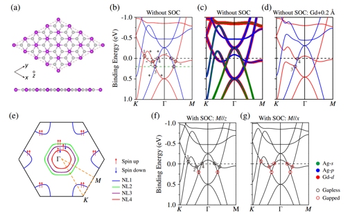 在最近的工作中,姚裕貴研究組與物理所馮寶杰研究員等人合作,通過理論分析、計算以及角分辨光電子譜觀測相結合的方法,證實了單原子層鐵磁材料GdAg2 是一種二維外爾“節線”半金屬。如圖1所示,單原子層鐵磁材料GdAg2中的外爾“節線”態具有自旋極化的特點和鏡面對稱性保護,具有很強的抗外部干擾能力。基于分子動力學模擬表明,單原子層GdAg2具有在其它基底上外延生長的可能,甚至存在從基底上剝離的潛力。此外,計算結果還表明,如圖1所示,通過控制磁化方向可以調控外爾“節線”態的開/關狀態。實驗上(如圖2所示),當單層GdAg2生長在Ag單質(111)表面時,外爾“節線”態處于費米能級附近。通過角分辨光電子譜測量, 他們發現沿著不同的方向上都有能隙閉合點,即證明了外爾“節線”半金屬的存在。由于樣品GdAg2的厚度已達到了原子極限,上述結果將為實現高效低耗、高集成度的微型化新型拓撲量子器件提供可能。 該工作得到國家自然科學基金委、科技部等單位的支持。研究團隊特別感謝四川師范大學付波濤博士,中科院寧波材料技術與工程研究所何少龍研究員,中科院物理所陳嵐研究員、吳克輝研究員,廣島同步輻射中心Koji Miyamoto、Kenya Shimada、Taichi Okuda, 日本廣島大學Shilong Wu等人的有力支持和配合。