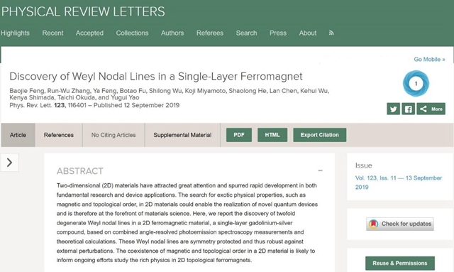 該工作發表于物理學最頂級的權威期刊《Physical Review Letters》(IF="9.227):Baojie" Feng,?* Run-Wu Zhang,? Ya Feng,? Botao Fu, Shilong Wu, Koji Miyamoto, Shaolong He, Lan Chen, Kehui Wu, Kenya Shimada, Taichi Okuda, and Yugui Yao*; “Discovery of Weyl Nodal Lines in a Single-Layer Ferromagnet”, Physical Review Letters, 123, 116401 (2019). (?為共同一作;*為通訊作者。)