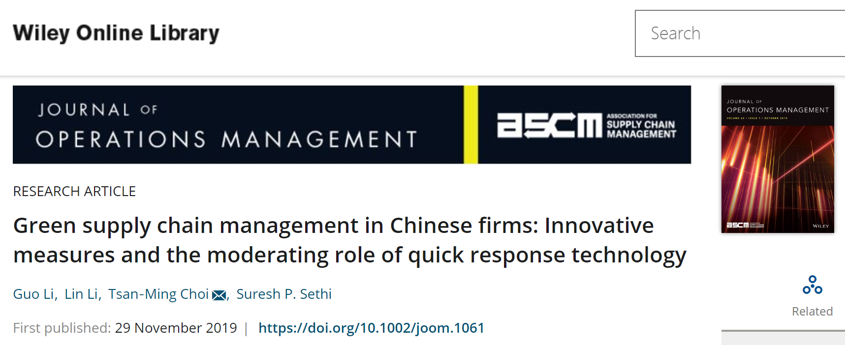Guo Li, Lin Li, Tsan-Ming Choi, Suresh P. Sethi. Green Supply Chain Management in Chinese Firms: Innovative Measures and the Moderating Role of Quick Response Technology. Journal of Operations Management. 2019, Doi: 10.1002/joom.1061.