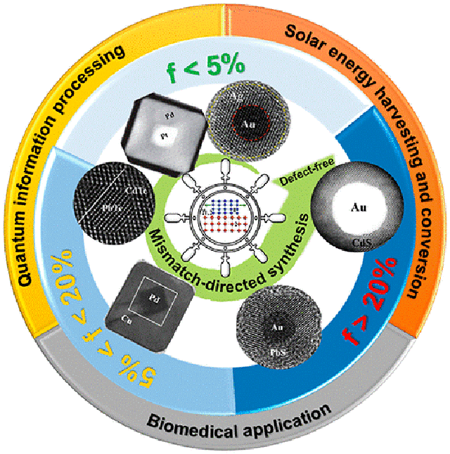異質(zhì)納米晶以納米或量子尺度的金屬或半導(dǎo)體材料做為基元構(gòu)件,在催化、能量轉(zhuǎn)化與存儲、光電器件、生物醫(yī)學(xué)診斷與治療、量子信息處理等領(lǐng)域具有重要的應(yīng)用前景。大量研究表明,不同基元構(gòu)件之間異質(zhì)界面的晶格結(jié)構(gòu)與電子特性對異質(zhì)納米晶的整體性能具有關(guān)鍵性作用,其深層原因是界面處晶格失配度的大小從熱力學(xué)上決定了晶體生長的不同機制。因此,晶格失配度是異質(zhì)納米晶合成與應(yīng)用中的一項重要參數(shù),其不僅與異質(zhì)納米晶合成的難易程度密切相關(guān),同時會對所合成材料界面處的晶格缺陷及晶格應(yīng)變狀態(tài)產(chǎn)生直接影響,從而可進一步用于調(diào)控異質(zhì)納米晶的電子與光學(xué)特性。
