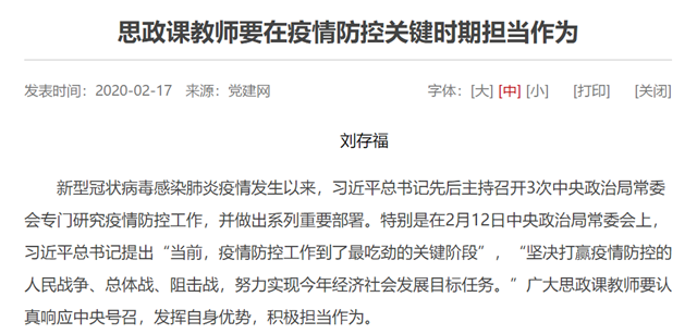 編輯:吳楠 審核:王征 閱讀次數(shù):新型冠狀病毒感染肺炎疫情發(fā)生以來(lái),習(xí)近平總書(shū)記先后主持召開(kāi)3次中央政治局常委會(huì)專(zhuān)門(mén)研究疫情防控工作,并做出系列重要部署。特別是在2月12日中央政治局常委會(huì)上,習(xí)近平總書(shū)記提出“當(dāng)前,疫情防控工作到了最吃勁的關(guān)鍵階段”,“堅(jiān)決打贏疫情防控的人民戰(zhàn)爭(zhēng)、總體戰(zhàn)、阻擊戰(zhàn),努力實(shí)現(xiàn)今年經(jīng)濟(jì)社會(huì)發(fā)展目標(biāo)任務(wù)?!睆V大思政課教師要認(rèn)真響應(yīng)中央號(hào)召,發(fā)揮自身優(yōu)勢(shì),積極擔(dān)當(dāng)作為。