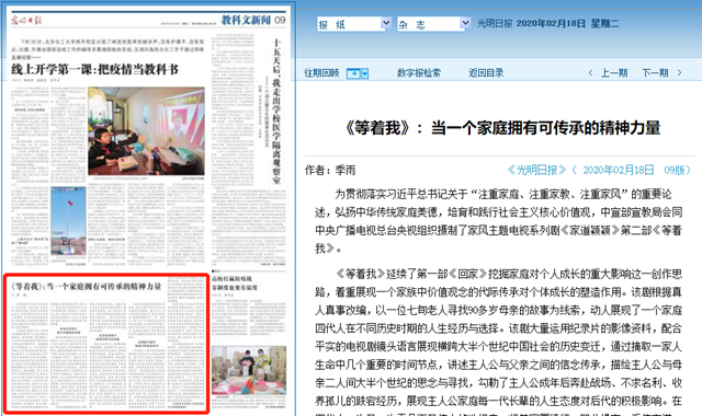 《等著我》延續了第一部《回家》挖掘家庭對個人成長的重大影響這一創作思路,著重展現一個家族中價值觀念的代際傳承對個體成長的塑造作用。該劇根據真人真事改編,以一位七旬老人尋找90多歲母親的故事為線索,動人展現了一個家庭四代人在不同歷史時期的人生經歷與選擇。該劇大量運用紀錄片的影像資料,配合平實的電視劇鏡頭語言展現橫跨大半個世紀中國社會的歷史變遷,通過摘取一家人生命中幾個重要的時間節點,講述主人公與父親之間的信念傳承,描繪主人公與母親二人間大半個世紀的思念與尋找,勾勒了主人公成年后奔赴戰場、不求名利、收養孤兒的跌宕經歷,展現主人公家庭每一代長輩的人生態度對后代的積極影響。在四代人一次又一次平凡而又偉大的選擇中,將其家國情懷、職業操守、重信守諾、友善助人的價值觀念潤物無聲地表現出來,激發情感共鳴,直指人心。愛奇藝的網友評論認為,該片正能量滿滿、特別感人,尤其是主人公一家傳承不息的“好男兒自食其力站著生,大丈夫以身報國不畏死”的家訓,給觀眾留下深刻印象。