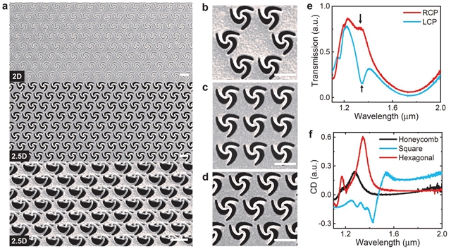 圖2 實(shí)驗(yàn)制備的立體超表面及其增強(qiáng)圓二色特性。