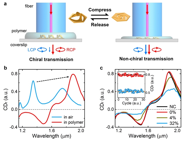 光頻波段三維超材料和二維超表面的動(dòng)態(tài)調(diào)諧是該領(lǐng)域器件應(yīng)用面臨的障礙之一。該報(bào)道的立體超表面擁有新穎的三維扭曲形貌和可逆形變特性,具備動(dòng)態(tài)調(diào)控的潛能。為此,合作團(tuán)隊(duì)利用單模光纖反復(fù)壓縮和釋放立體超表面,在實(shí)驗(yàn)上實(shí)現(xiàn)了近紅外波段圓二色性的片上可逆調(diào)諧,為立體超表面在力、熱、光、電、磁、聲等領(lǐng)域的動(dòng)態(tài)調(diào)控應(yīng)用提供了重要的技術(shù)參考。