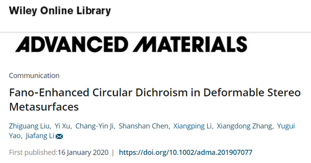 文章信息:Zhiguang Liu#, Yi Xu#, Chang-Yin Ji#, Shanshan Chen, Xiangping Li, Xiangdong Zhang, Yugui Yao, and Jiafang Li*, “Fano-enhanced circular dichroism in deformable stereo metasurfaces”, Advanced Materials 32, 1907077 (2020). (#為共同一作;*為通訊作者)