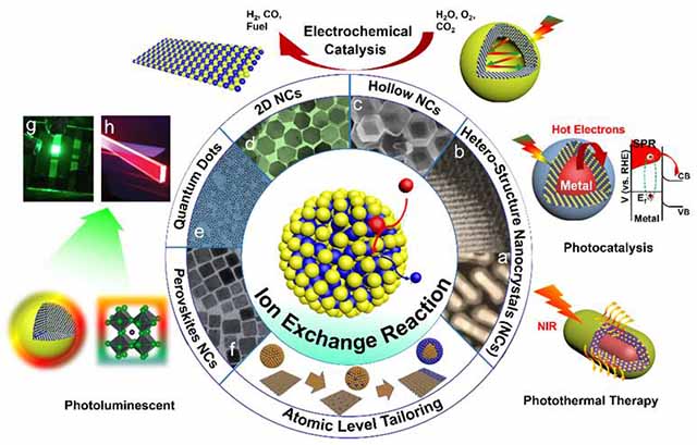 無機(jī)膠體納米晶,由于尺寸、形貌、組分調(diào)控合成引起的光電性能調(diào)控及應(yīng)用受到了科學(xué)界的廣泛關(guān)注。進(jìn)一步功能化應(yīng)用過程中,納米晶的異質(zhì)結(jié)構(gòu)、摻雜以及與尺寸、形貌調(diào)控的有效結(jié)合具有重要的科學(xué)和應(yīng)用意義。離子交換反應(yīng),近幾年逐步發(fā)展成為合成可控組成、界面和形貌的無機(jī)納米晶的有效策略,在材料化學(xué)領(lǐng)域具有重要的科學(xué)和應(yīng)用價(jià)值。例如,與傳統(tǒng)方法相比,逆向競(jìng)爭(zhēng)陽離子交換反應(yīng)制備得到的深位點(diǎn)摻雜的量子點(diǎn),可以提高摻雜量子點(diǎn)的熒光量子產(chǎn)率和熒光壽命;離子交換策略,可以實(shí)現(xiàn)在原子級(jí)層面調(diào)控大晶格失配度下的金屬-半導(dǎo)體異質(zhì)界面,更有利于等離子激元與激子的耦合以及熱電子的注入,實(shí)現(xiàn)高效的光催化產(chǎn)氫;通過離子交換策略實(shí)現(xiàn)的無機(jī)鈣鈦礦納米晶的組分調(diào)控和異價(jià)摻雜,可以有效實(shí)現(xiàn)其熒光位置調(diào)節(jié)和熒光穩(wěn)定性的提高等等。因此,離子交換反應(yīng)對(duì)于液相無機(jī)納米晶的合成,具有重要的應(yīng)用價(jià)值。