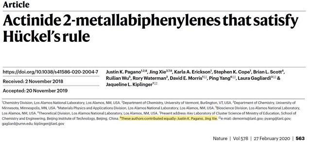 編輯:李亞鑫 審核:張加濤 閱讀次數:近日,北京理工大學化學與化工學院引進的特立青年學者謝靜教授在《Nature》雜志上合作發表題為“Actinide 2-metallabiphenylenes that satisfy Hückel’s Rule”(符合“休克爾定律”的錒系金屬取代亞聯苯化合物)的文章(Nature 2020, 578, 563-597), 錒系金屬讓芳香性和反芳香性環共存。謝靜教授為該論文的共同第一作者,負責完成論文的理論計算部分,此研究是與美國洛斯阿洛莫斯國家實驗室Jaqueline L. Kiplinger課題組以及美國明尼蘇達大學Laura Gagliardi教授合作完成。