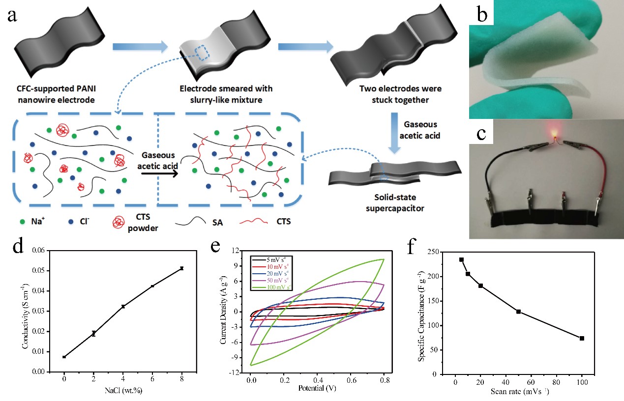 趙健等基于SD-A-SGT法構(gòu)建了殼聚糖/海藻酸鈉(CTS/SA)復(fù)合聚電解質(zhì)復(fù)合物理水凝膠,其可在8%的NaCl電解質(zhì)加入情況下保持0.29MPa的拉伸強(qiáng)度,保障了水凝膠在良好力學(xué)強(qiáng)度前提下優(yōu)異的電子傳輸效應(yīng)。將上述水凝膠與聚苯胺電極組裝成超級(jí)電容器(圖2)。電解質(zhì)具有極高的離子電導(dǎo)率(0.051 S·cm-1)和優(yōu)異的力學(xué)性能,拉伸強(qiáng)度達(dá)0.29 MPa,斷裂伸長率為達(dá)109.5%。用聚電解質(zhì)和常規(guī)聚苯胺(PANI)納米線電極制備的固態(tài)超級(jí)電容器在5 mV·s-1下具有234.6 F·g-1的高比電容,1000次循環(huán)后具有95.3%的電容保持率和良好的循環(huán)穩(wěn)定性,為制備可生物降解的全天然高分子超級(jí)電容器開辟了一條新的途徑。上述成果發(fā)表于 J. Power Sources (2018, 378, 603-609)。