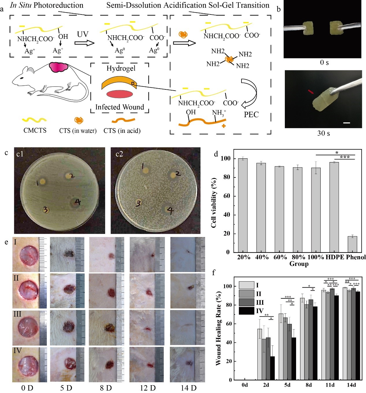 圖4. CTS/CMCTS/AgNPs水凝膠制備及應(yīng)用。(a)SD-A-GT形成機(jī)理;(b)自愈合30s水凝膠能夠支持自身重量;(c)抗菌性能,c1為金黃色葡萄球菌,c2為銅綠假單胞菌;(d)細(xì)胞相對(duì)增值率;(e)銅綠假單胞菌感染傷口的閉合性,Ⅰ為CTS/CMCTS/AgNPs水凝膠敷料,Ⅱ?yàn)镃TS/CMCTS水凝膠敷料,Ⅲ為夫西地酸乳膏對(duì)照組,Ⅳ為空白對(duì)照組;(f)不同敷料的傷口閉合率