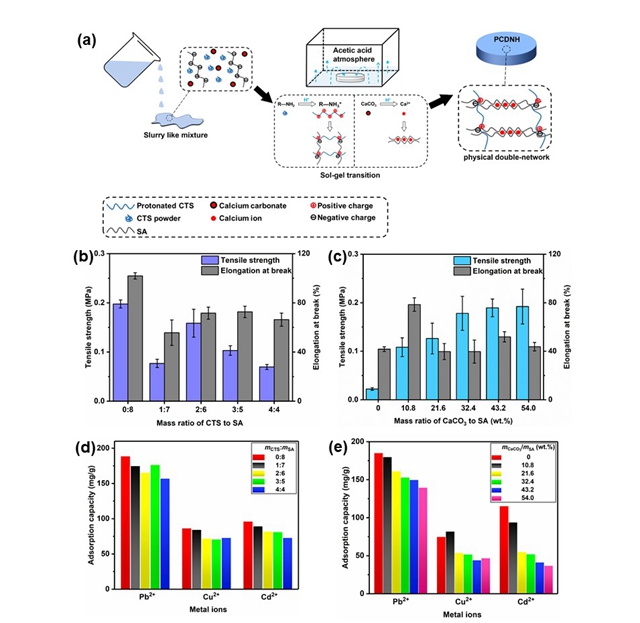 圖3. CTS/SA/Ca2+ PCDNH的制備及性能測(cè)試。(a)CTS/SA/Ca2+ PCDNH的制備示意圖及形成機(jī)理;(b)(c)CTS/SA/Ca2+ PCDNH的拉伸強(qiáng)度和斷裂伸長率;(d)(e)CTS/SA/Ca2+ PCDNH對(duì)三種重金屬離子的吸附量。