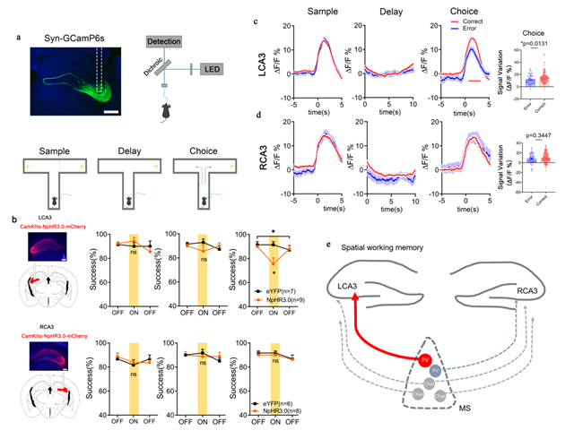 海馬CA3在空間工作記憶中起到重要作用,但是CA3在空間工作記憶的哪個(gè)階段起作用,以及CA3的單側(cè)化功能是否體現(xiàn)在空間工作記憶中尚不清楚。該工作利用光纖記錄技術(shù)發(fā)現(xiàn)小鼠CA3的神經(jīng)元活動(dòng)性在空間工作記憶的編碼和檢索階段均有升高,而左側(cè)CA3神經(jīng)元在選擇階段作出正確選擇時(shí)顯示出更高的活動(dòng)性。隨后, 利用在體電生理技術(shù)發(fā)現(xiàn)左側(cè)CA3神經(jīng)元在選擇階段有先于右側(cè)CA3神經(jīng)元放電的趨勢;接著利用光遺傳學(xué)技術(shù)發(fā)現(xiàn),在選擇階段只有抑制左側(cè)海馬CA3神經(jīng)元活動(dòng)性可以損壞小鼠在空間工作記憶中的表現(xiàn)。最后利用逆行病毒載體示蹤技術(shù)發(fā)現(xiàn)上游腦區(qū)內(nèi)側(cè)隔核(MS)向左右側(cè)CA3區(qū)不同類型神經(jīng)元的投射有所區(qū)別,光遺傳抑制MS-LCA3環(huán)路能夠損害小鼠在空間工作記憶中的任務(wù)表現(xiàn),并且顯示出該環(huán)路調(diào)控CA3單側(cè)化功能。