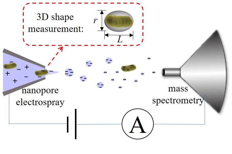 接下來,課題組提出了納米孔電噴霧離子源的概念與原理,通過測量分子在穿越微米到納米尺寸的電噴霧噴口時引起的噴霧電流的擾動,目前初步實現了微生物等顆粒的三維幾何尺寸測量。該方法與質譜儀器相結合,未來可大幅提高質譜技術的未知物鑒定和三維結構解析能力(Yu Zhang, Yang Tang,… Wei Xu*, ACS Central Science, 2020, 6, 6, 1001–1008)。