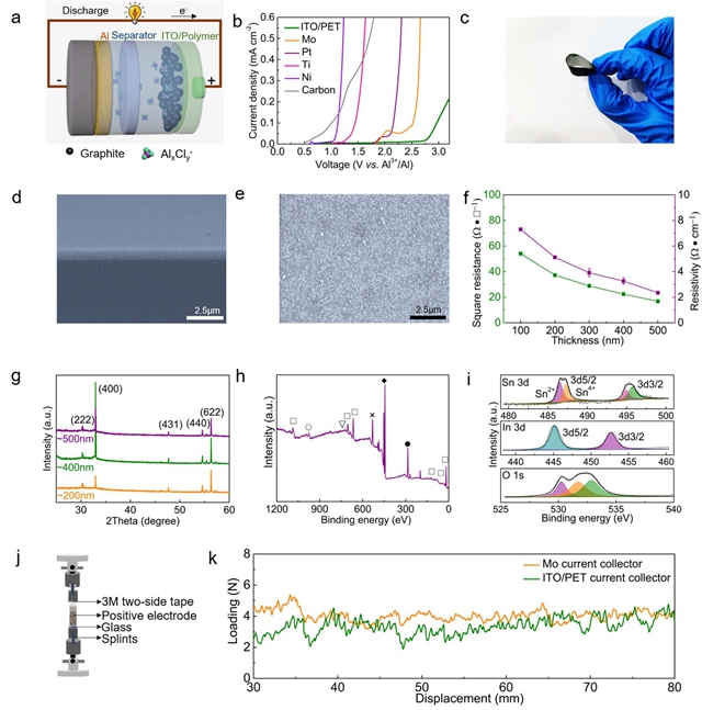 圖1. 非金屬ITO/PET集流體的特征。鋁離子電池與穩定的ITO/PET集流體。(a)鋁離子電池放電過程示意圖。(b)不同集流體材料在AlCl3/[EMIm]Cl(比例~1.3)離子液體電解質體系中的極化曲線。(c)涂覆正極材料的ITO/PET集流體圖片。(d,e) ITO/PET集流體的橫截面及平面的SEM圖像。(f)不同ITO濺射厚度(樣品從100到500nm)的表面電阻和電阻率。(g)不同濺射厚度ITO的XRD衍射譜。(h) ITO的XPS光譜,其中符號表示:In 3d (?)、Sn 3d(△)、O 1s (x)、C 1s(●)、In(□)、Sn (▽), O (○)。(i) Sn、In、O的XPS譜。(j)用于剝離強度試驗的力學拉伸器示意圖。(k)不同集流體剝離強度數據。