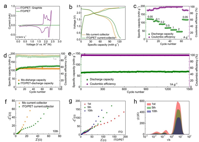 圖2. 電化學性能。(a) 涂有石墨活性材料的ITO/PET集流體作為正極,組裝鋁離子電池的CV曲線(紫色),純ITO/PET集流體的CV曲線(綠色)。(b)在電流密度為50 mA g?1的情況下,使用石墨涂層的Mo和ITO/PET集流體的全電池的恒流充放電曲線。(c)使用ITO/PET集流體的全電池在不同電流密度下的比放電容量。(d)基于Swagelok器件,在50 mA g?1條件下的Mo和ITO/PET集流體的全電池循環性能的比較。(e)使用ITO/PET集流體進行全電池長循環穩定性測試(1A g?1)。(f)利用Mo和ITO/PET集流體測試的交流阻抗圖譜。(g)使用ITO/PET集流體,全電池在不同循環周期的EIS交流阻抗圖譜。(h)利用ITO/PET集流體對不同狀態的全電池EIS數據的DRT(弛豫時間分布)分析。